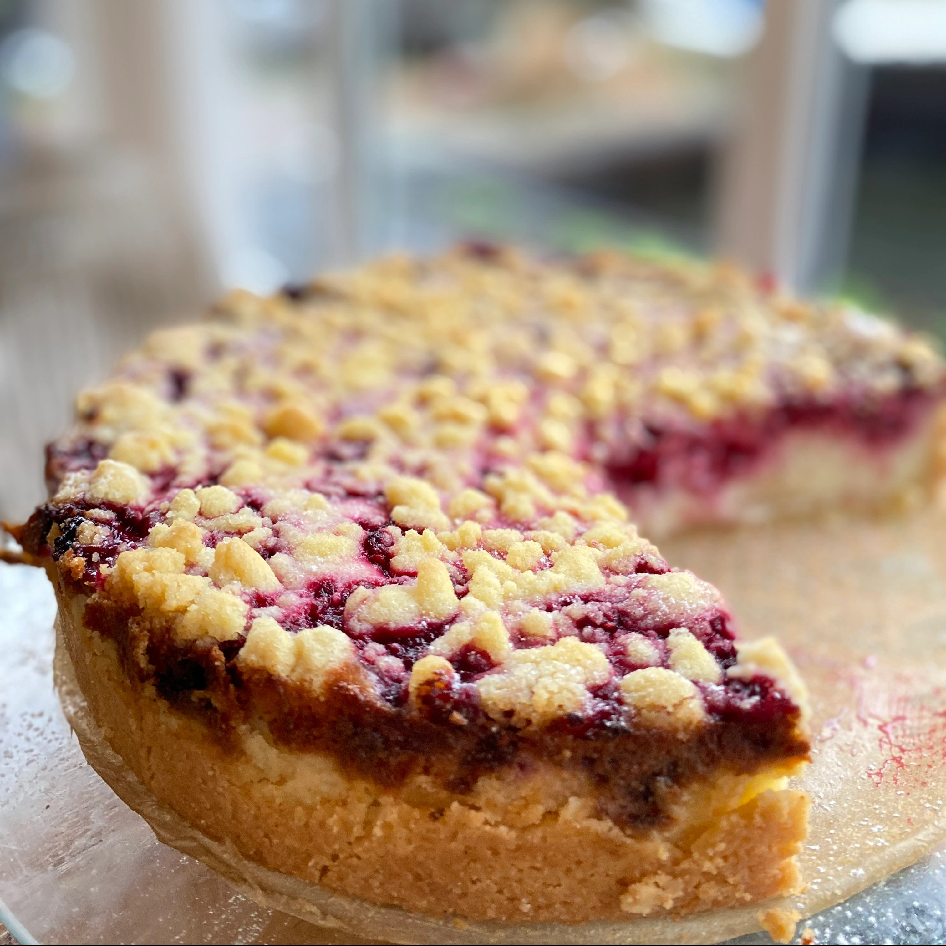 Zuletzt die Streusel auf dem Kuchen verteilen und bei 175 °C Umluft etwa 60 Minuten backen, bis die Streusel goldbraun sind. Den Kuchen dann ein paar Stunden komplett auskühlen lassen, da die Creme sonst noch zu weich sein könnte und er auslaufen würde. Am besten kalt aus dem Kühlschrank servieren und nach belieben noch mit Puderzucker bestreuen.